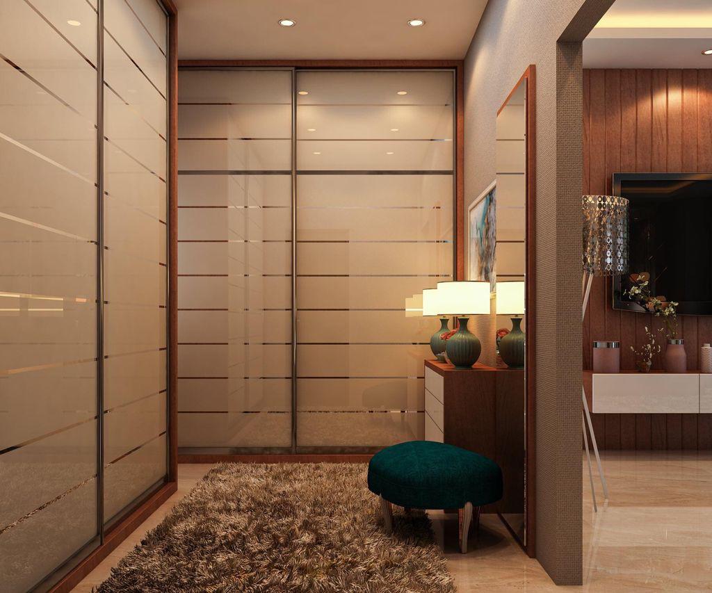 This contemporary wardrobe with glass shutters is more than just a storage solution—it introduces the concept of a walk-in design within the bedroom. The layout integrates seamlessly into the room, offering a dedicated space for organising clothes, accessories, and essentials. The walk-in element is enhanced by the thoughtful division of storage zones, with illuminated sections.The glass shutters connect to the interiors of the wardrobe, giving it an open and inviting appearance, . For the walk-in design, you can add a central island or seating space within the area to maximise utility and create a boutique-inspired setup
