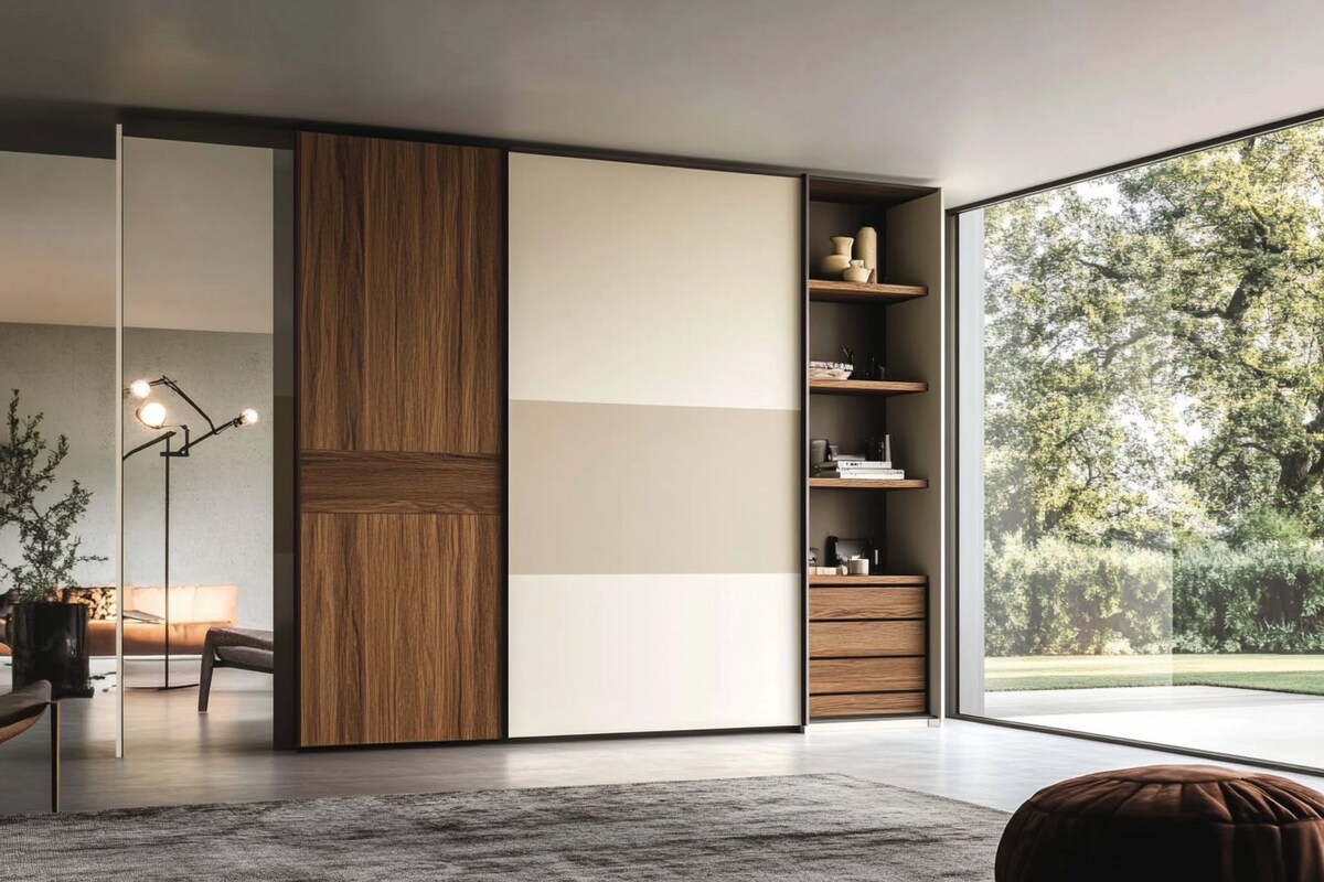 This modern 2-door sliding wardrobe combines the crisp look of white with the warm texture of wood, offering a functional yet stylish storage solution. The wardrobe’s clean lines and smooth sliding doors make it a perfect fit for contemporary bedrooms. The white panels are crafted to brighten the space while the wood accents add a touch of nature, creating a harmonious balance. Inside, the wardrobe offers ample space for organising clothes, accessories, and more, keeping everything neatly tucked away. An open wooden shelf provides a convenient spot for displaying your favourite decor pieces or keeping everyday essentials within easy reach. Whether in a master suite or guest room, its modern appeal and thoughtful features make it an ideal choice for any home