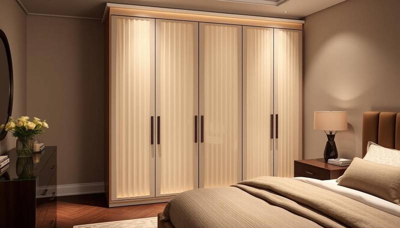 A frosted glass wardrobe like this one not only looks beautiful but plays a crucial role in hiding away your morning clutter. The light shade exterior of this wardrobe design is a subtle choice to achieve a relaxed bedroom interior. Moreover, the floating shelves let you display decor items, knicks and knacks, creating a distinctive look.